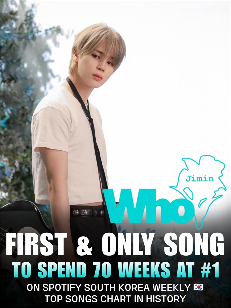 세계 최대 음원 플랫폼 스포티파이(Spotify)의 12월 25일 자 차트 업데이트에 따르면, 지민의 2집 솔로앨범 'MUSE'(뮤즈) 타이틀곡 'Who'(후)는 스포티파이 한국 '위클리 톱 송' 차트에서 70주째 1위에 올랐다. 이로써 해당 곡은 현재까지 총 70번의 1위를 달성, 이는 차트 역사상 70주 1위에 오른 최초이자 유일 기록이자 최다 1위 기록이다.