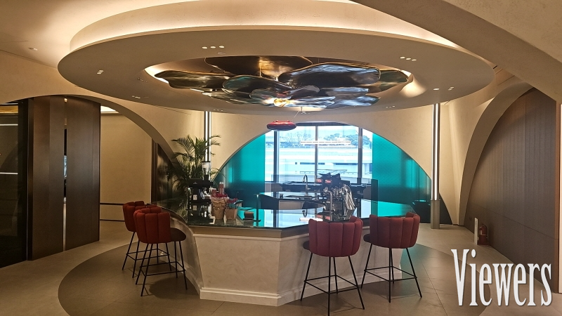(음료를 제공하는 라운지 카페와 꽃을 형상화한 천장 조형물, 사진=문재혁 기자)