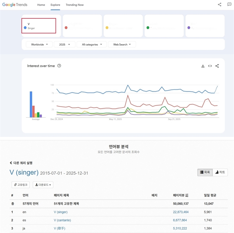 구글 트렌드(Google Trends)에 따르면 뷔는 2025년 최다 검색량을 기록한 K팝 스타에 등극했다. 뷔는 구글 트렌드가 집계되는 81개국의 나라에서 미국을 비롯한 77개국에서 최다 검색 1위를 기록하고 있다. 구글 트렌드는 여러 지역과 언어로 검색 쿼리의 인기도를 분석하는 구글의 웹사이트이다.