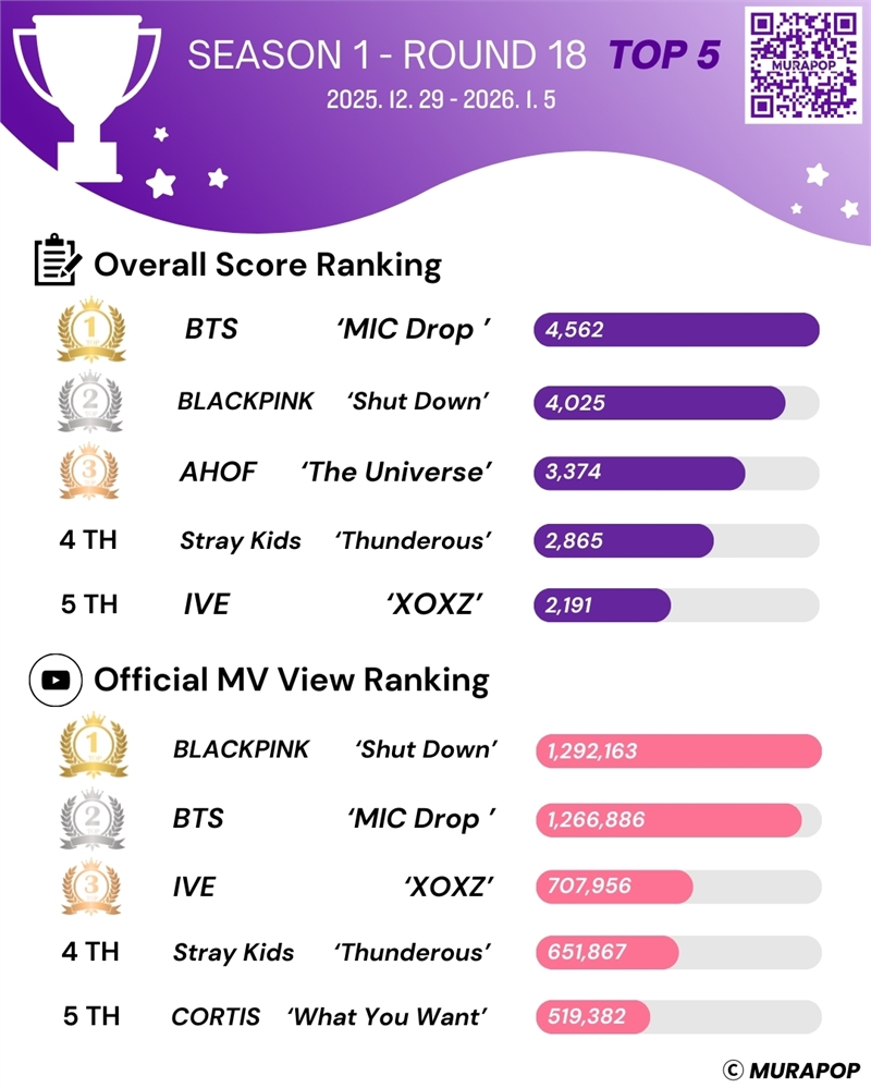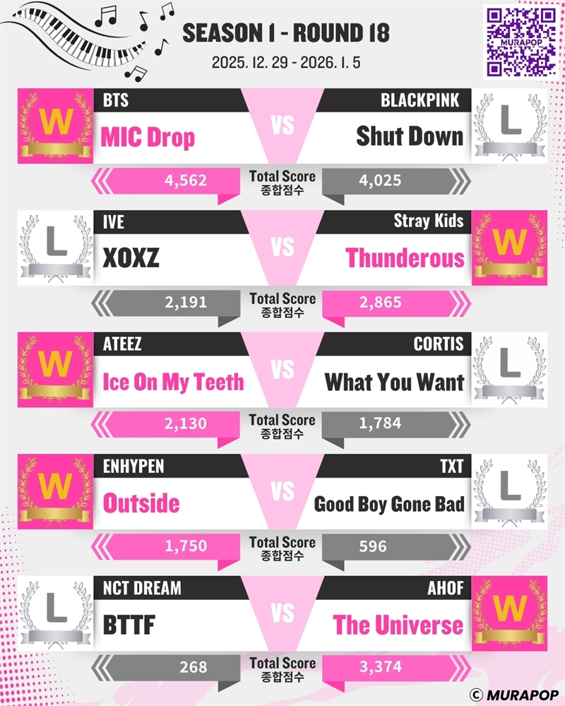 최근 글로벌 K-POP 매치 플랫폼 MURAPOP(뮤라팝) 시즌 1의 마지막 18회차가 종료됐다. 이번 회차는 시즌 피날레에 걸맞게 글로벌 톱 그룹 간 빅매치, 조회수와 득표율이 쟁쟁했다. 방탄소년단과 블랙핑크의 대결은 시즌 1의 마지막 회차를 상징하는 빅매치였다.
