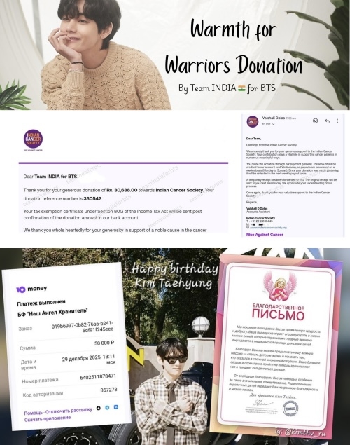 인디아 팬베이스 ‘Team INDIA’는 경제적인 어려움으로 치료를 받지 못하고 있는 소아암 환우를 위해 ICS에 기부금을 전했다. 튀르키예 팬 베이스 ‘Vante Blogs’도 유니세프에 긴급 구호 아동 기금에 기부했다.