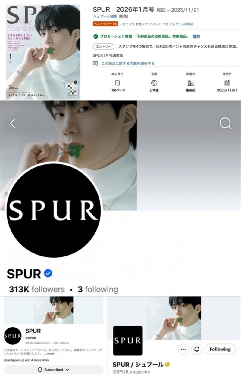 최근 글로벌 아티스트 진이 표지 모델로 등장한 일본 잡지 SPUR 2026년 1월호가 발매 직후 아마존 재팬 베스트셀러 정상에 올랐다. 교보문고에서도 품절 사태가 발생하며 진의 막강한 브랜드 파워를 입증했다.