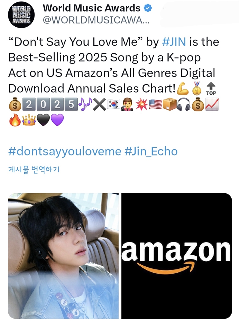방탄소년단(BTS) 진의 솔로곡 'Don't Say You Love Me'가 글로벌 인기와 영향력을 다시 한번 입증했다.