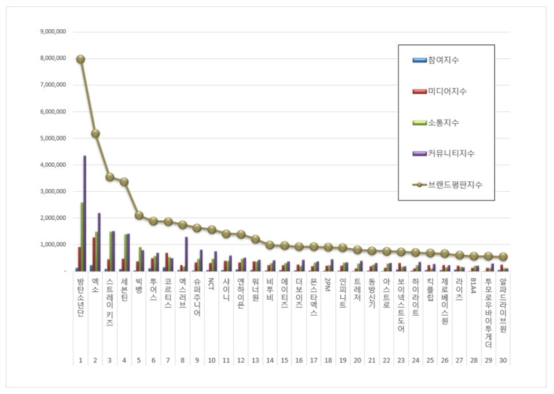 보이그룹 브랜드평판 1위를 기록한 방탄소년단(RM, 진, 슈가, 제이홉, 지민, 뷔, 정국) 브랜드는 참여지수 12만 9465, 미디어지수 91만 8043, 소통지수 259만 5623, 커뮤니티지수 433만 3440이 되면서 브랜드평판지수 797만 6571로 분석됐다. 지난 12월 브랜드평판지수 대비 16.84% 상승했다.