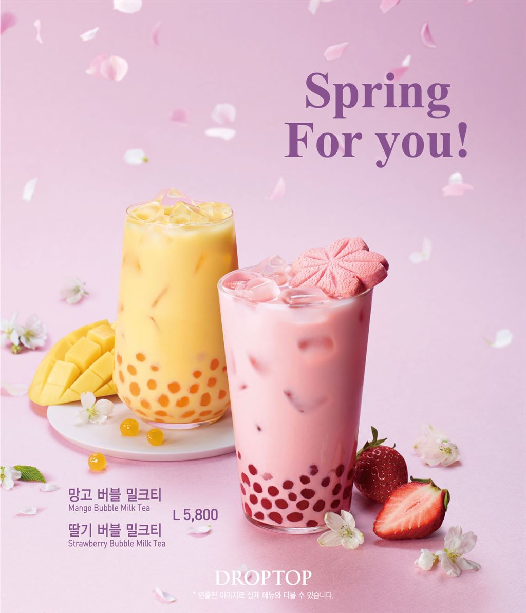 드롭탑의 ‘과일 버블 밀크티 2종’은 자스민티를 직접 우린 베이스로 만든 프리미엄 티베리에이션 음료다. 올해에도 꾸준한 인기인 버블과 봄 시즌에 어울리는 과일을 더해 시원하고 달콤하게 즐길 수 있다. 쫄깃한 천연 과즙 펄을 사용해 과일의 맛과 향, 색감을 두 배로 구현한 것이 특징이다.