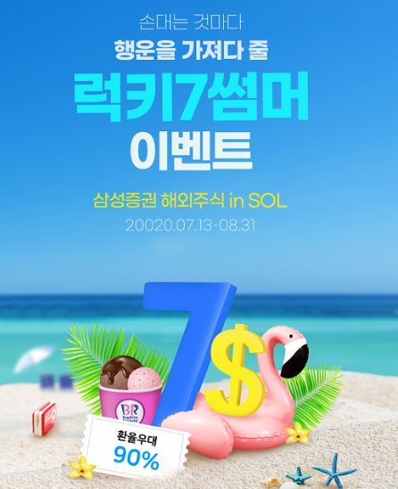 오늘부터 8월 31일까지 진행되는 이벤트는 신한은행 외화 체인지업 예금과 삼성증권 해외주식 계좌를 연결하고 원화대가로 미화 7불 이상 입금하는 고객을 대상으로 선착순 1500명에게 미화 7불을 제공하고 1501번째 고객부터 3000번째 고객에게는 베스킨라빈스 아이스크림 기프티콘을 제공한다.