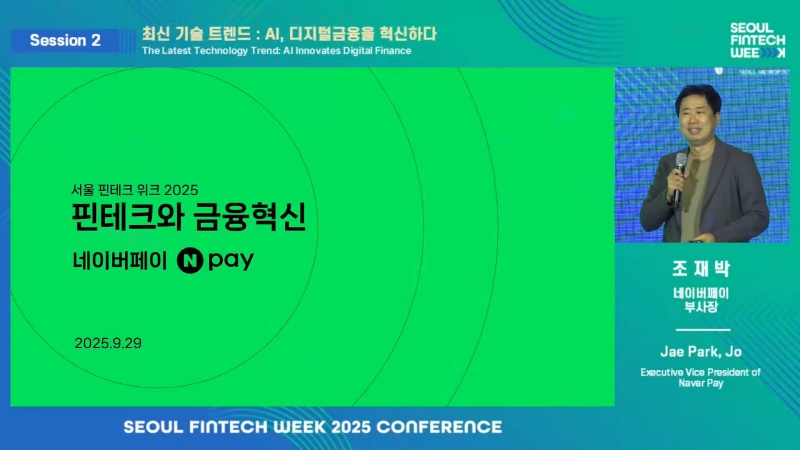 "글로벌 핀테크의 성장은 사회적 문제를 해결하거나 지원해온 결과다. 네이버페이도 사회 문제를 함께 고민하며 성장하고 싶다."조재박 네이버페이 부사장은 지난 29일 여의도 콘래드 서울에서 열린 '서울 핀테크위크 2025' 세션2에서 '핀테크와 금융혁신'를 주제로 한 세션 발표에 나서 이 같이 말했다. 이날 조 부사장은 한국