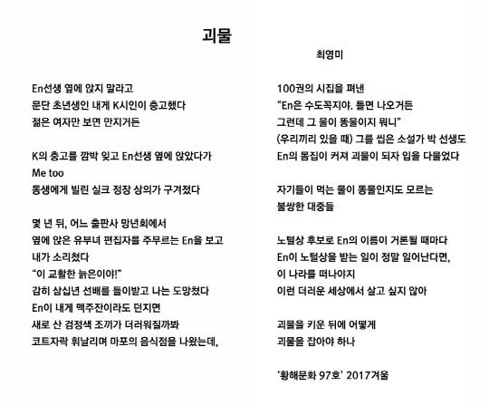 원로 시인은 어째서 입을 열지 않는 것일까. 항간의 소문에 의하면 고은 시인을 둘러싼 주변 정리가 고은 시인의 입장을 고려한 것이라는 말도 나온다. 개인적 입장을 고려한 철거와 철회라니, 이 소문마저도 억울할 법 한데 원로 시인은 나서지 않고 있다. 아름다운 언어로 노벨문학상 후보로까지 거론되며 추앙받던 시인은 자신의 이름과 삶, 업적까지 더럽혀지는 데도 묵묵부답이다. 그가 원하는 것은 무엇일까. 증거없이 기억으로 이어지는 공방이 차츰 잊혀져 가길 바라는 것일까, 아니면 진실이 아니니 대응할 필요도 없다는 것일까. 어디서도 그의 속내를 들을 수 있는 경로는 없다. 문단 관계자들에 따르면 그는 현재 전화도 받지 않고, 개인 메일도 열어보지 않는 상태다. 고은 시인의 성폭력 의혹. 목격자와 피해자는 ‘진실’이라고 목소리를 높인다. 가해자로 지목된 고은 시인의 속내는 고은 시인만이 알 일이다.