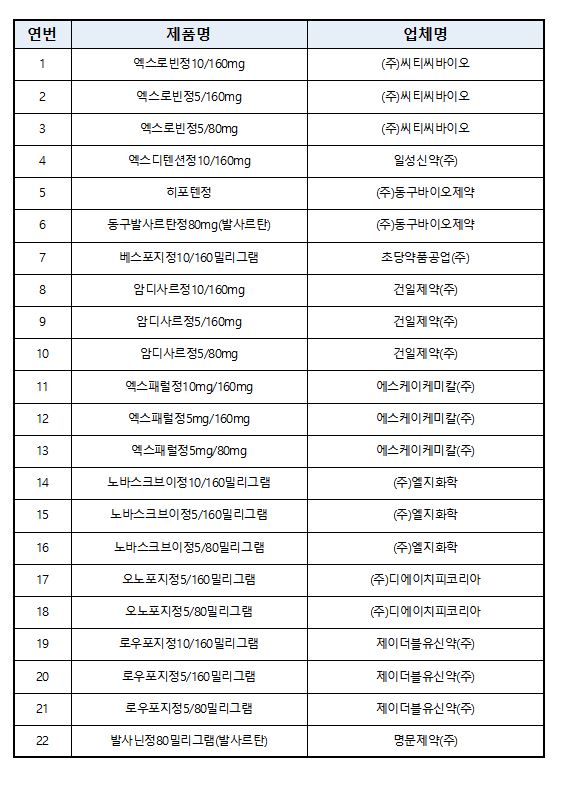 4차 판매중지 조치 해제 처분을 받은 발사르탄제제 품목명과 제약사 목록(자료=식품의약품안전처)
