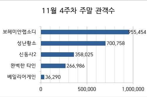 3위 ‘신비한 동물들과 그린델왈드의 범죄’는 35만 8025명, 4위 ‘완벽한 타인’은 26만 6986명, 5위 ‘베일리 어게인’은 3만 6290명의 관객을 모았다.