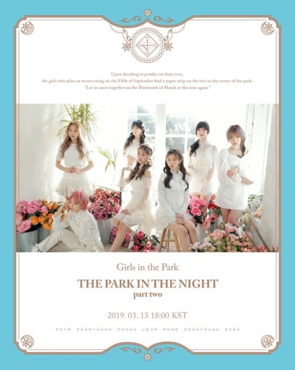 공원소녀(서령, 서경, 미야, 레나, 앤, 민주, 소소)는 12일 공식 SNS 채널을 통해 두 번째 미니앨범‘밤의 공원 파트 투(THE PARK IN THE NIGHT part two)’의 무빙포토와 재킷 이미지를 게재해 눈길을 끌었다.