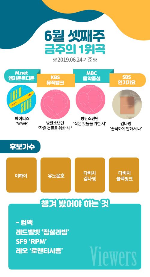 6월 셋째 주 음악방송은 그룹 방탄소년단이 여전히 기세를 떨친 가운데, 그룹 에이티즈와 김나영이 새로운 강자로 떠올랐다.