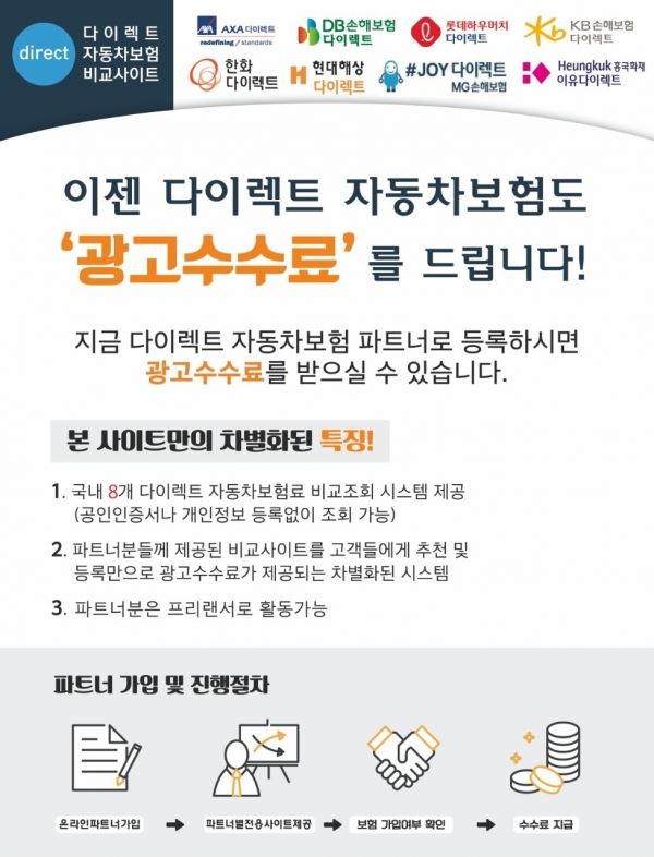 다이렉트 자동차보험 비교사이트를 제공받아 보험소비자들에게 추천이나 등록만으로 광고수수료가 제공되는 시스템이다. 설계사라면 누구나 신청할 수 있다.