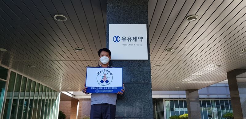 유유제약 제천공장 임직원들이 코로나19 극복을 위한 격려 메시지를 전달하는 ‘스테이 스트롱’ 캠페인에 동참했다고 19일 밝혔다.