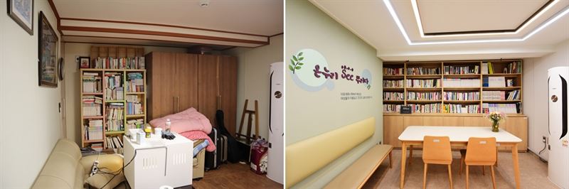 거실에서는 영화 감상이 가능하고 개별 수납공간도 새롭게 마련했다. 아모레퍼시픽 인테리어팀이 공간 컨설팅 및 도면 작업에 재능기부로 동참하고, 내부 시설물의 정리와 수납은 지역의 경력단절 여성들이 참여해 사업에 의미를 더했다.