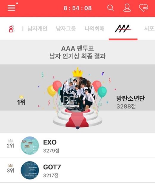 투표 결과 마지막까지 순위를 예측할 수 없을 정도로 치열한 접전 끝에 방탄소년단이 3288점(35.9%)을 얻어 남자 아이돌 부문 1위에 올랐다. 2위는 EXO(3279점), 3위는 GOT7(3217점)이 각각 차지했다.