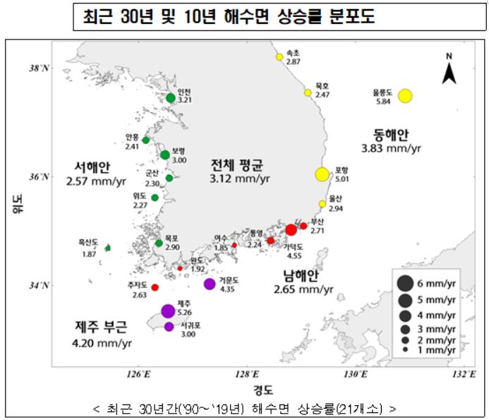 해수면은 30년간 평균적으로 매년 3.12mm씩 높아졌다. 해역별 평균 해수면 상승률은 제주 부근(연 4.20mm)이 가장 높았다. 이어 동해안(연 3.83mm), 남해안(연 2.65mm), 서해안(연 2.57mm) 순이다.