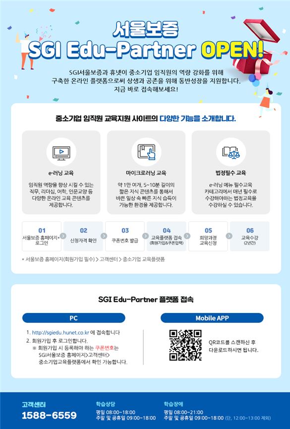 ‘SGI 에듀 파트너’는 서울보증보험이 교육전문기업인 휴넷과 제휴해 구축한 서비스로 교육 기회가 부족한 중소기업 임직원을 대상으로 직무, 어학, 인문교양, 법정 교육 등 약 1만여 개의 교육 콘텐츠를 무상으로 제공하는 서비스다.