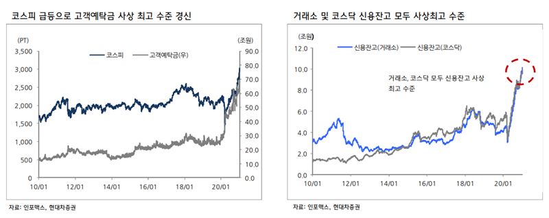 이들은 보고서에서 "현재 고객예탁금은 70조원으로 과거 10년 평균 (20조원) 대비 3.5배 이상 증가하고, 신용잔고는 10조원으로 과거 10년 평균 (3.6조원) 대비 2.8배 이상 증가했다"며 "M2 대비 고객예탁금+ 주식형펀드 펀드 설정액은 4.0%로 과거 고점(2008년, 5.5%)에 비해 아직 낮은 수준"이라고 진단했다.