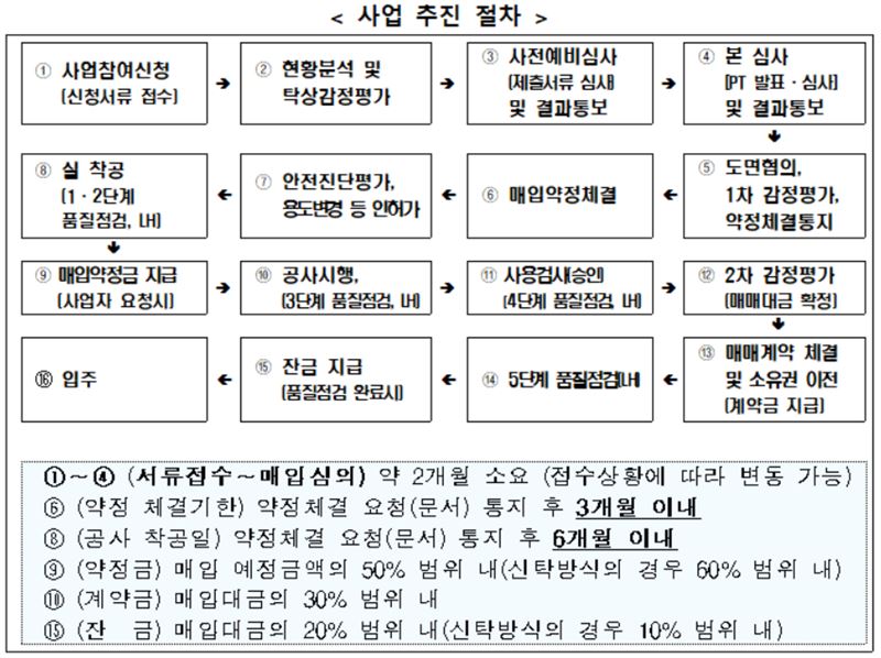 사업절차는 이날부터 다음달 5일까지 서류접수 이후 매입약정을 체결하고 이후 공사(5단계 품질점검), 준공, LH 매입, 입주 순으로 이루어진다.