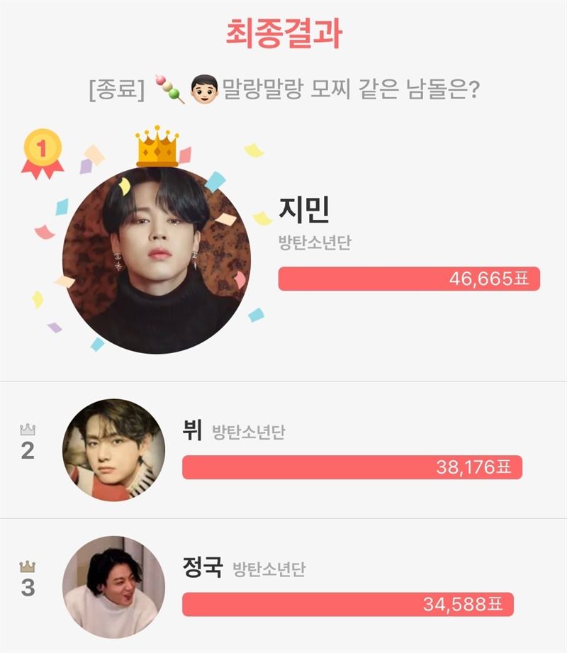 아이돌 커뮤니티 ‘최애돌’은 ‘말랑 말랑 모찌 같은 남돌은?’이란 주제로 올 1월 28일부터 2월 3일까지 7일간 투표를 진행했다. 약 12만명의 투표 인원 중 약 5만명이 지민을 선택했다. 지민이 압도적 1위를 차지했다.