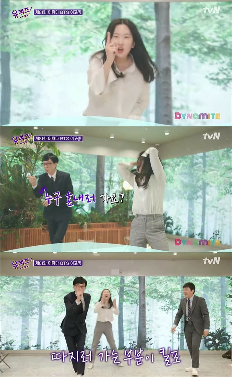 BTS 댄스 여고생은 'BTS 춤으로 어쩌다 조회수 700만 뷰의 주인공'으로 '유퀴즈'에 출연, 자신이 방탄소년단 '아미'(BTS 팬클럽)임을 밝히며 히트곡 'Dynamite'(다이너마이트) 댄스를 선보인 바 있다.