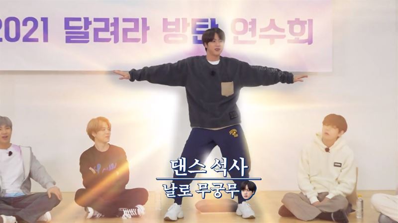지난 23일 방송된 ‘달려라 방탄’ 134회 에피소드는 ‘연수회 특집’ 2편이었다. 정보 검색왕 게임에 이은 두번째 게임은 ‘내 댄스를 맞혀봐’였다. 첫 문제의 정답자는 진이었고, 진은 곧바로 무반주에 맞춰 정답 ‘idol’ 댄스를 선보였다.