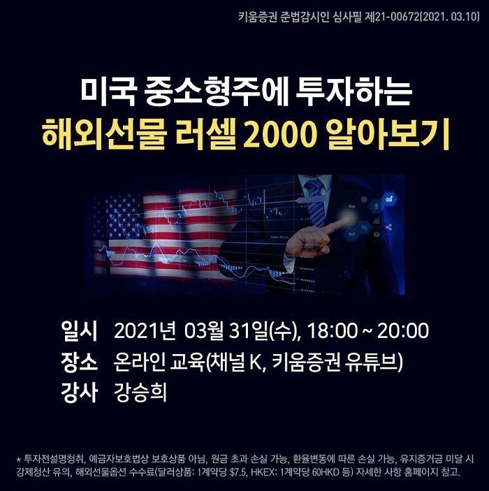 키움증권은 오는 31일 18시부터 20시까지 ‘채널K’, ‘키움증권 유투브’를 통해 ‘미국 중소형주에 투자하는 해외 선물 러셀2000 투자전략’을 주제로 상품 설명 및 시장 분석 세미나를 개최한다.