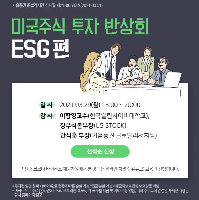 분기마다 진행될 예정인 온라인 미국주식 투자 반상회 1기에서는 ‘ESG 투자’를 주제로 이향영 한국 열린사이버대학교 교수, 장우석 US STOCK 본부장 그리고 안석훈 키움증권 글로벌 리서치팀장이 진행한다. 키움증권 홈페이지나 영웅문 글로벌에서 시청 가능하다.