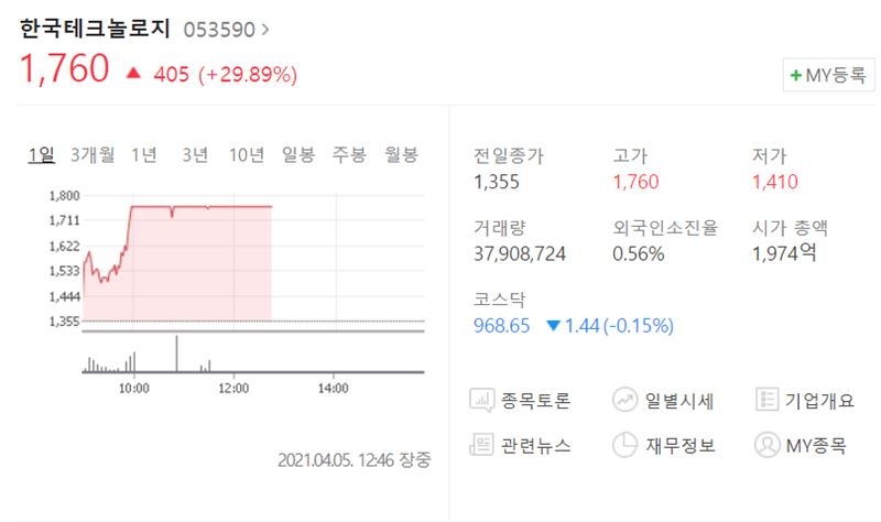 한국거래소에 따르면 한국테크놀로지는 5일 오후 1시 6분 현재 28.89% 오른 1760원에 거래되고 있다.
