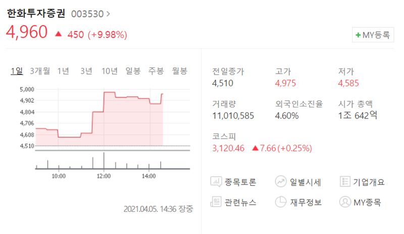 한국거래소에 따르면 한화투자증권은 5일 오후 2시 36분 현재 9.98% 상승한 4960원에 거래되고 있다. 한화투자증권 우선주는 30% 오른 1만3650원에 거래 중이다.