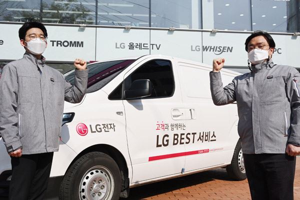 LG전자는 두 명의 엔지니어가 팀을 이룬 2인 전담 서비스를 확대 운영하며 고객에게 보다 빠른 서비스를 제공하고 있다. 서비스 엔지니어들이 2인 전담 서비스를 위한 차량 앞에서 포즈를 취하고 있다. (사진=LG전자)