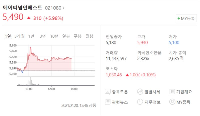 에이티넘인베스트가 두나무 1분기 최대 실적 발표에 급등했다 (사진=네이버) 에이티넘인베스트가 두나무 1분기 최대 실적 발표에 급등했다. 한국거래소에 따르면 에이티넘인베스트는 20일 오후 1시 46분 현재 5.98% 오른 5490원에 거래 중이다. 에이티넘인베스트는 두나무 지분 6.05%를 보유한 것이 알려지며 ‘두나무 관련주’로 분류됐다. 앞서 두나무가 뉴욕증시 상장을 고려하고 있다는 소식에 에이티넘인베스트의 주가가 영향을 받았다. 0 0 뷰어스 이승아 기자 blair7984@viewers.co.kr 이승아 기자의 기사 더보기 저작권자 ⓒ뷰어스 무단전재 및 재배포 금지