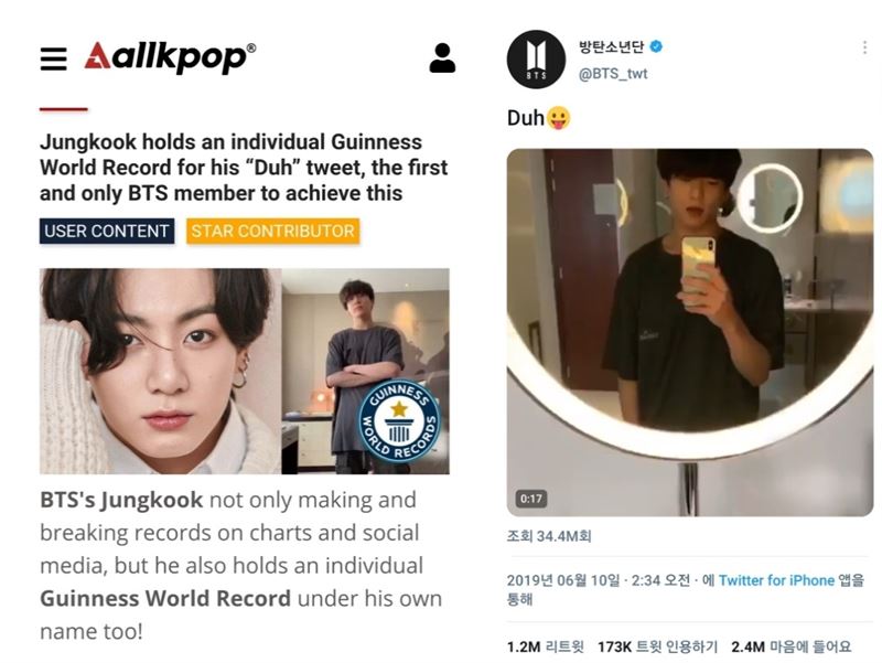 지난 19일 올케이팝은 "정국이 방탄소년단 멤버 최초이자 유일하게 'Duh' 트윗으로 개인 기네스 세계 기록을 보유하다"라는 제목의 기사를 게재했다. 매체는 정국이 각종 차트나 소셜 미디어에서 기록을 수립하고 경신하는 것은 물론이고 개인 기네스북 세계 기록도 보유하고 있다고 설명했다. 이어서 정국의 'Duh' 트윗이 '2019년 최다 리트윗된 트윗'으로 기네스북 세계 기록을 세웠다고 덧붙였다.