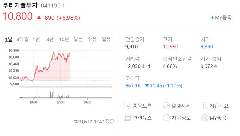 한국거래소에 따르면 우리기술투자는 12일 오후 12시 42분 현재 8.98% 상승한 1만800원에 거래 중이다.