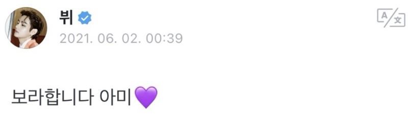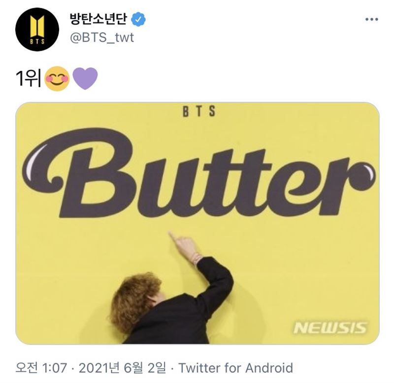 2일 새벽 뷔는 방탄소년단 공식 트위터와 팬 커뮤니티 위버스를 통해 'Butter'의 빌보드 핫 100 1위를 자축했다. "보라합니다 아미💜", "1위☺💜"라는 글과 함께 센스있는 사진도 잊지 않았다.