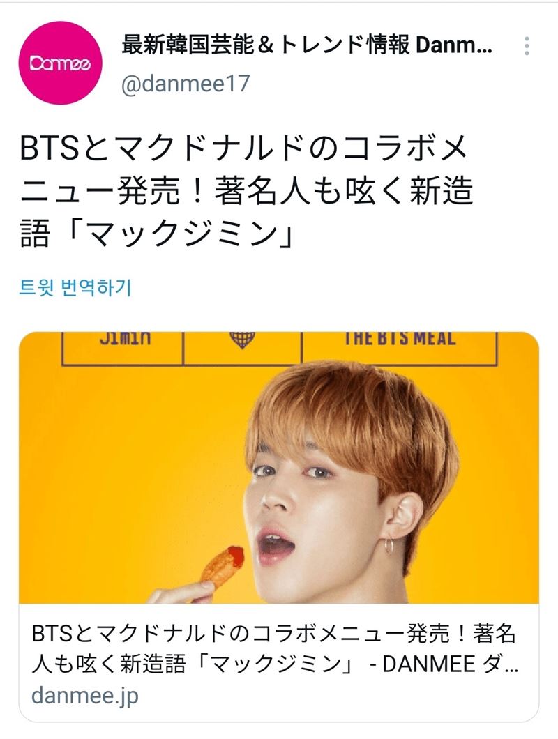 지난달 31일 일본 매체 단미(Danmee)는 “불행히도 일본에서는 (The BTS 세트가) 판매되지 않는다”고 아쉬움을 토로하며 방탄소년단과 맥도날드를 대표하는 신조어 '맥지민'(McJimin)을 소개하고 “관련 검색어에 오를 정도로 화제가 집중됐다”고 강조했다.