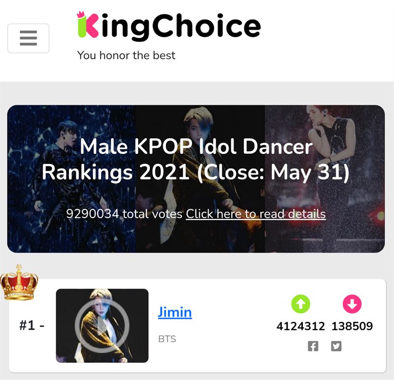 방탄소년단 지민이 글로벌 투표 킹초이스(King Choice) 'Male K-POP Idol Dancer Rankings 2021’에서 2년 연속 1위를 차지했다.