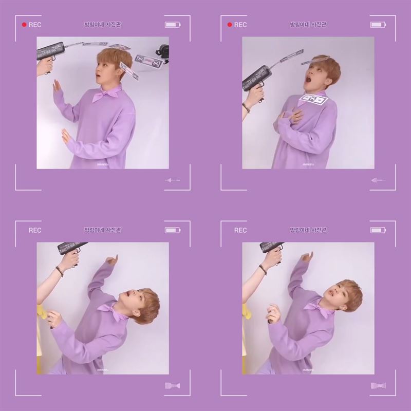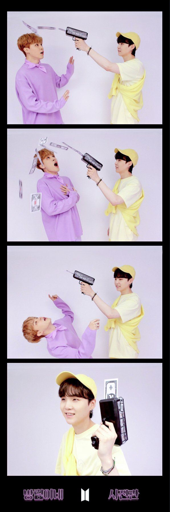 슈가가 현금 플랙스에 사용되는 총을 쏘면 지민이 맞고 쓰러지는 사진, 도망치는 슈가를 지민이 잡는 사진 등 재미있는 설정의 콘티 그대로 완벽하게 재현하여 미션 성공으로 상품까지 획득했다. 이어진 지민의 단독 네컷 사진은 요즘 유튜버들과 SNS에서 유행하는 애완견들 앞 주인이 사라지는 영상에서 착안, 지민이 직접 그린 콘티를 선택해 촬영했다.