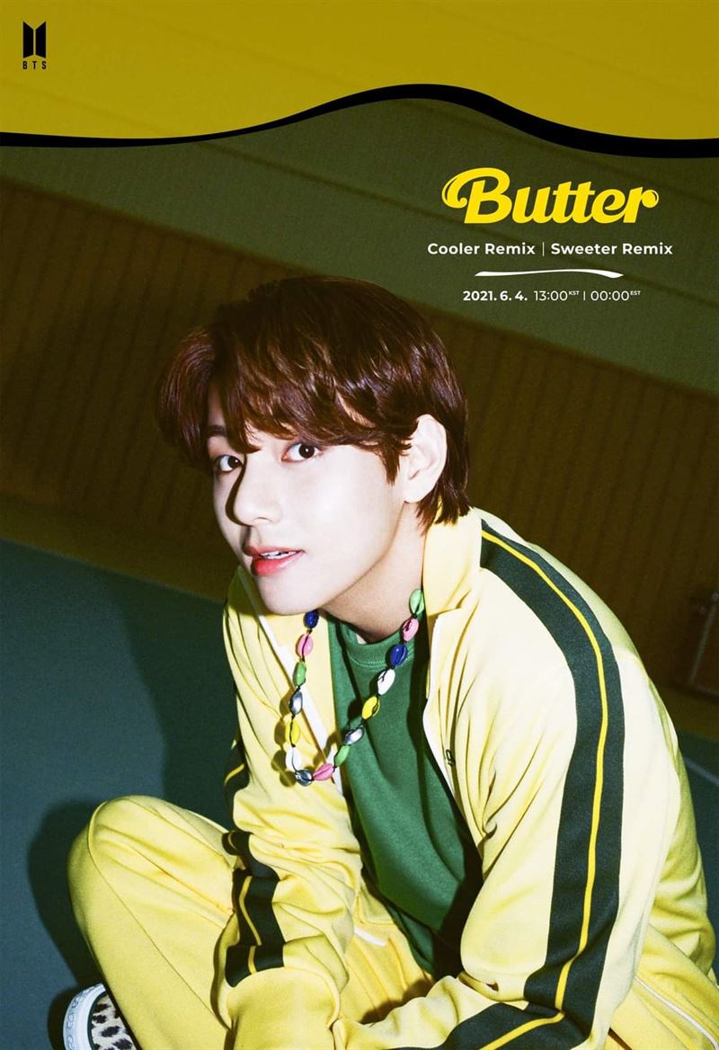 지난 3일 방탄소년단은 싱글 ‘Butter’의 새 리믹스 버전 발매를 예고하며 ‘Remix Teaser Photo(Sweeter / Cooler ver.)’를 위버스와 SNS에 공개했다. 이전 티저 포토와는 달리 ‘Sweeter / Cooler’라는 버전에 걸맞게 멤버들은 스포티한 착장으로 자유분방한 모습을 보여줬다. 뷔는 산뜻한 초록색 티셔츠에 싱그러운 노란색 트랙탑과 팬츠를 매치해 상큼하고 싱그러운 매력을 뽐내며 새로운 리믹스 버전에 대한 기대감을 높였다.
