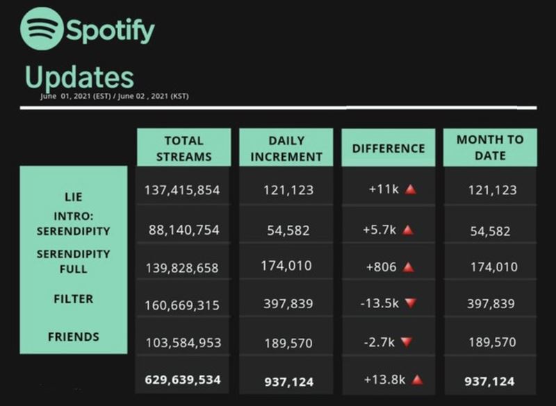 또한 스포티파이에서 방탄소년단의 모든 곡을 비롯해 참여한 전체 노래 중 가장 인기있는 곡 톱10 중 9위로 팀 전체 솔로곡에서 유일하게 차트인했다. 이는 방탄소년단의 모든 솔로곡 중에서 가장 높은 순위로, ‘Filter’가 수록된 정규 4집 ‘Map Of The Soul : 7’의 타이틀곡 ‘ON’보다도 높은 순위에 올라 그 뜨거운 인기를 입증하고 있다.