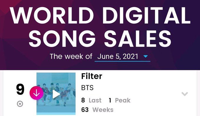 빌보드에 따르면, 지난 2일에 발표된 월드 디지털 송 세일즈 차트(6월 5일)에서 9위에 오른 지민의 'Filter'는 차트 진입 후 63주 차트인 기록을 세웠다. 9위를 차지한 ‘Filter’는 방탄소년단 솔로곡 중에서 가장 높은 순위이자 톱10위 내 유일한 솔로곡으로 차트 역사상 최장 기간인 51주 동안 ‘톱10’에 차트인하며 신기록을 또 다시 자체 경신했다.