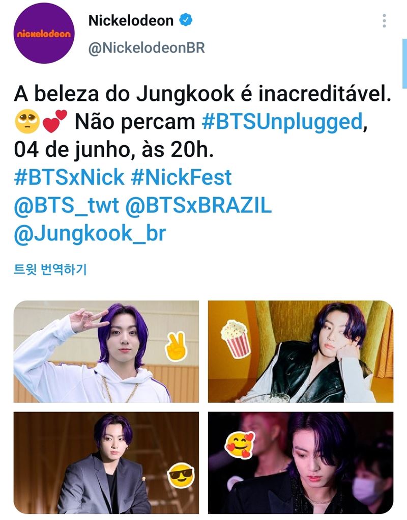 지난 1일 니켈로디언 브라질 공식 트위터 계정은 "정국의 아름다움은 믿기지 않는다"는 글과 정국의 사진으로 6월 4일 오후 8시(현지시간) 니켈로디언에서 방탄소년단 'MTVUnplugged'(MTV 언플러그드)가 방송된다고 홍보했다. 공개된 정국의 사진은 방탄소년단 신곡 'Butter'의 콘셉트 포토로, 니켈로디언은 팝콘, 손가락 브이, 눈에 하트가 그려진 얼굴 등 다양한 이모티콘으로 애정을 드러냈다.