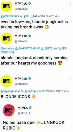 앞서 지난 2월 미국의 음악 전문 방송 'MTV'가 방영하는 언플러그드 특별 무대에 방탄소년단이 출연한 가운데, 'MTV Asia' 공식 계정은 "저 해상도에도 금발 정국은 숨을 멎게 한다", "금발 정국은 우리의 심장을 노리고 있어, 세상에", "금발의 아이콘" 이라며 세 번 연속 금발 정국을 찬양하는 글을 게재해 화제가 된 바 있다. 'MTV LA'(MTV 라틴아메리카) 공식 계정 역시 "금발 정국, 나는 무엇을 해야 할지 모르겠다" 라는 애정의 글을 게시했다.