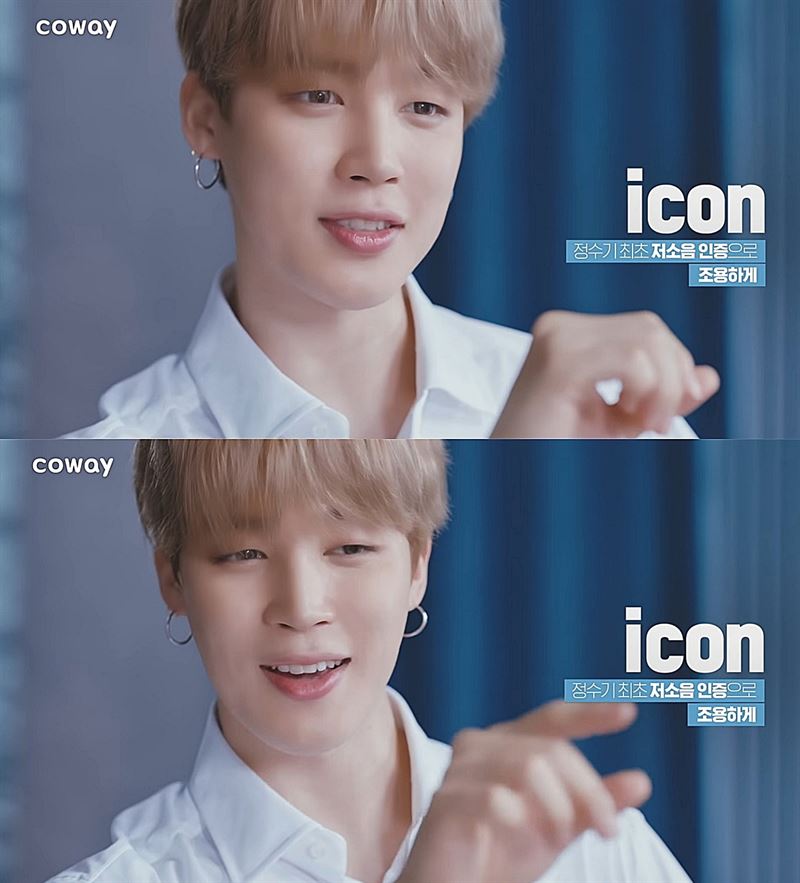 지난 7일 방탄소년단이 공식 모델로 활동하고 있는 코웨이는 '정수기 선택 토론회'라는 제목의 영상을 공개했다. 지민은 깔끔한 화이트 셔츠에 이마를 가리는 동안 헤어스타일, 순백의 엔젤미로 시선을 모으며 등장, 광고 제품 정수기 이미지에 부합하는 맑고 순수한 매력을 선보였다.