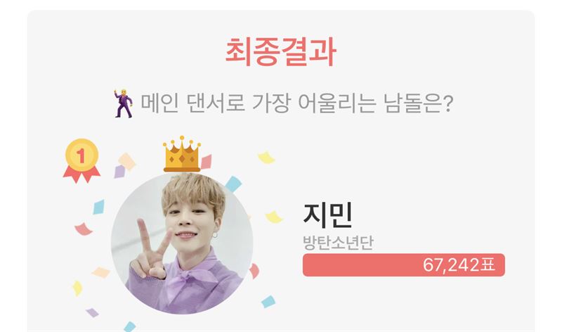 아이돌 인기 순위 서비스 '최애돌'은 지난 3일부터 9일까지 '메인댄서로 가장 어울리는 남자 아이돌’이라는 주제로 투표를 진행했다. 지민은 총 6만 7242표를 받아 1위에 올랐다.