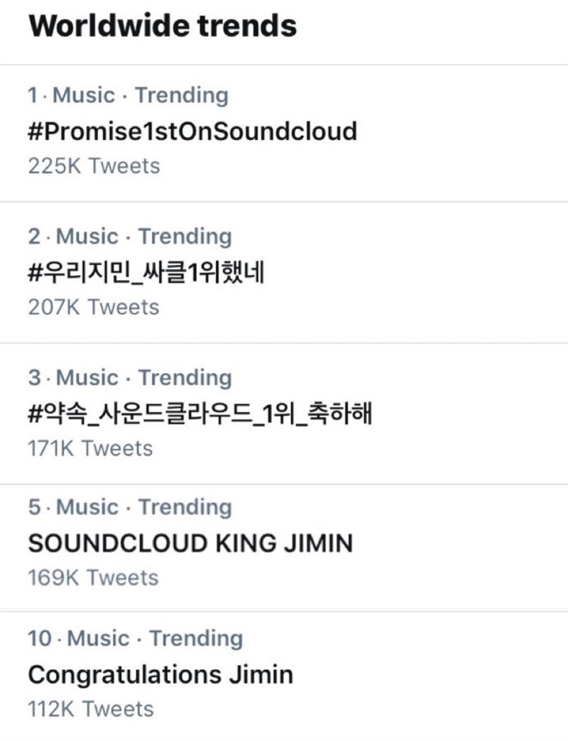 전세계 스트리밍 1위가 전해지자 팬들은 해시태그를 통해 해당 소식을 축하했다. 'Promise1stOnSoundcloud', '약속_사운드클라우드_1위_축하해', '우리지민_싸클1위했네', 'SOUNDCLOUD KING JIMIN', 'Congratulations Jimin' 등의 글이 전세계 실트 1~4위를 장악했다.