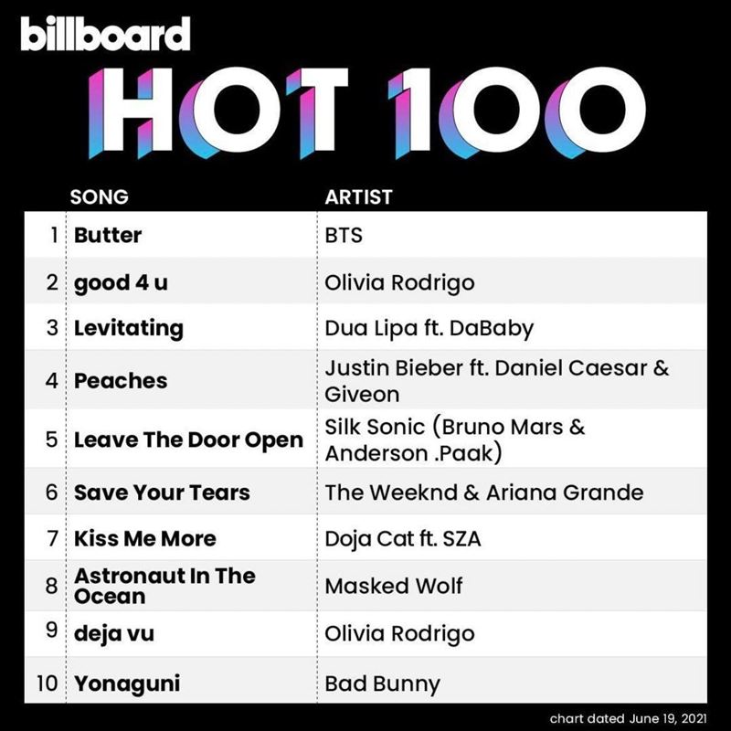 방탄소년단은 지난해 8월 공개한 디지털 싱글 'Dynamite'로 2주 연속 '핫 100' 1위 기록을 세운 바 있으나 3주 연속 정상을 수성한 것은 이번이 처음이다. 이로써 방탄소년단은 'Dynamite'로 한국 가수 최초 '핫 100' 1위를 달성한 이래 피처링에 참여한 'Savage Love' 리믹스 버전, 앨범 'BE'의 타이틀곡 'Life Goes On', 그리고 'Butter'까지 통산 8번 '핫 100' 정상을 밟았다.