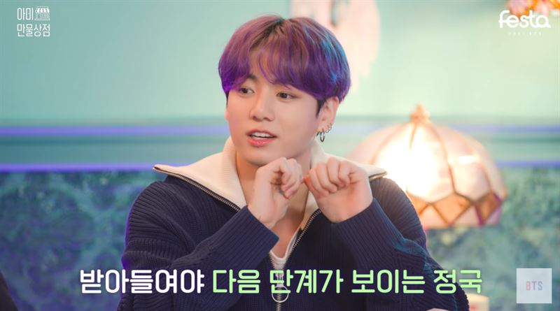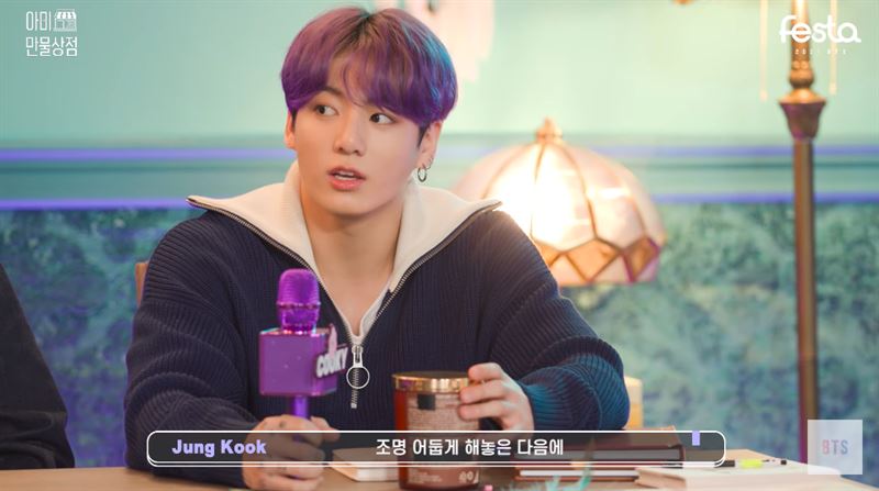 끝으로 방탄소년단은 아미를 위해 며칠을 고민하며 아미 만물상점에 맡길 물건을 소개하는 시간을 가졌다. 정국은 향초와 마이크를 선택했다. “향초를 틀어놓고 조명 어둡게 해놓은 다음에 노래 틀고 앉아 있으면 기분이 좋다”라며 정국다운 귀여운 이유를 밝혔다. 이어 “요즘 노래방 못 가고 하니까 집에서 조촐하게 노래 부르고 싶을 때 혼자 노래를 부르던 추억이 있다”며 덧붙였다.