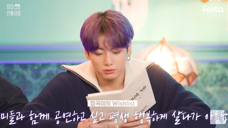 ‘아미들은 타임머신을 타고 어디로 가고 싶을 것 같아요?’에 대한 질문에 정국은 “데뷔 초 아닐까? 우리를 처음부터 보고 싶어할 것 같고. 그리고 처음부터 가서 지금까지 계속 함께 하지 않을까?”라며 아미의 생각을 정확히 꿰뚫기도 했다. 위시 노트에서는 “아미들과 함께 공연하고 싶고 평생 행복하게 살다가 아름답게 마무리하고 싶다”고 한 문장으로 자신의 바람을 얘기했다.